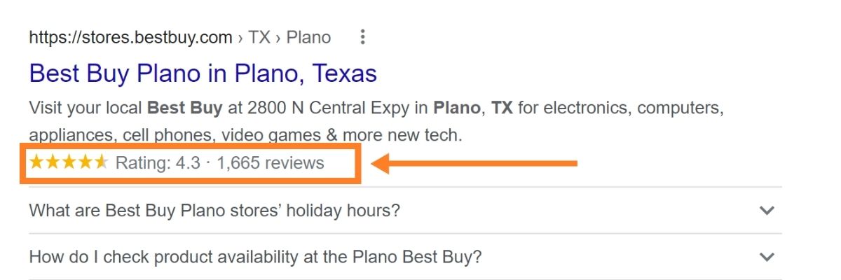 Shows ratings and reviews that enhance social proof. Very useful for product pages, restaurants, or service providers. Positive review snippets improve trust and can significantly boost conversions.
